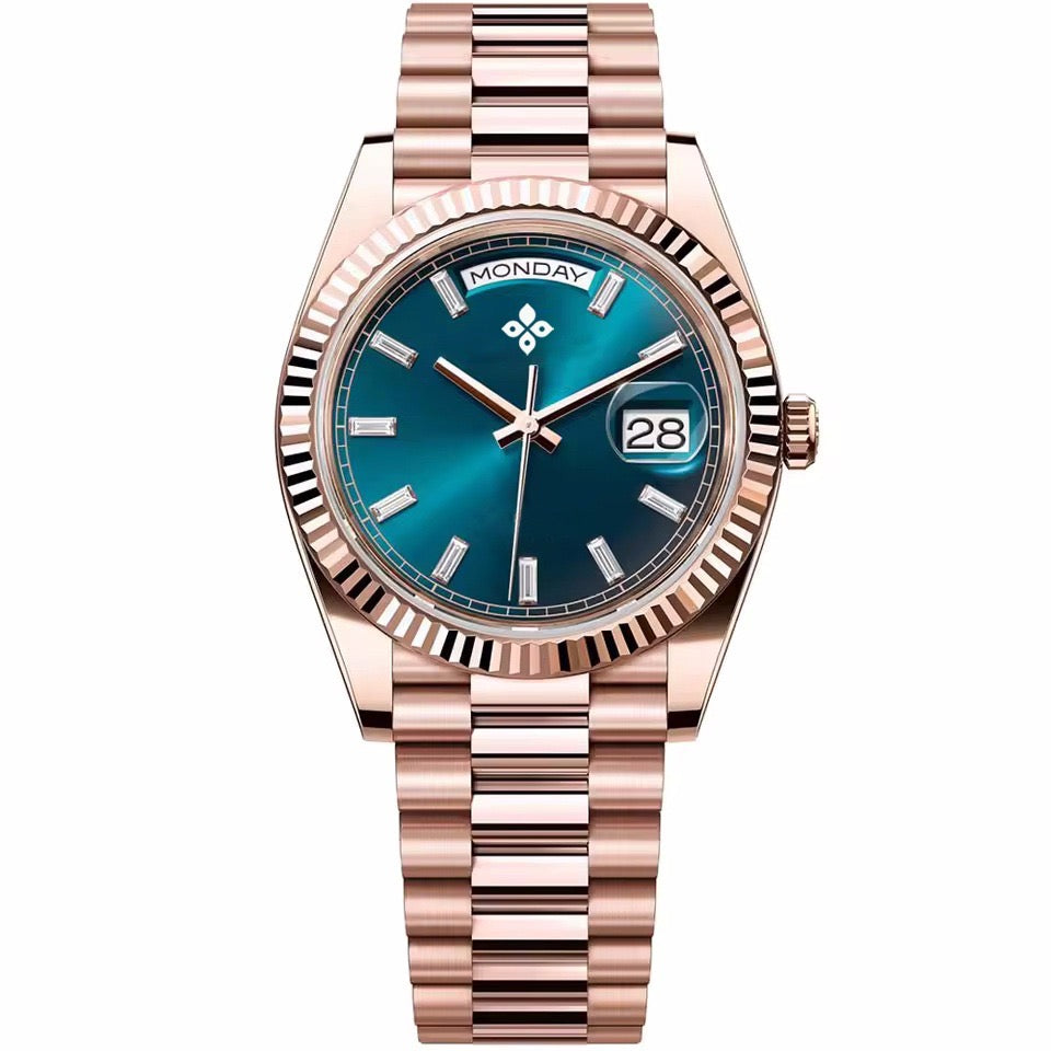 A striking fusion of rose-gold elegance and vibrant turquoise depth, crafted for those who appreciate refined luxury. The Azure Rose President features a radiant turquoise sunburst dial paired with a polished rose-gold president-style bracelet for a bold yet sophisticated presence. Powered by a reliable Miyota automatic movement and protected by scratch-resistant sapphire crystal, this 40 mm timepiece offers durable clarity and consistent performance. With 10 ATM water resistance and a solid stainless-steel construction, it delivers modern prestige and timeless style for everyday wear.