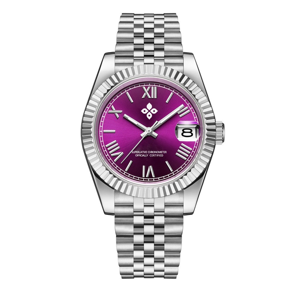 A bold expression of modern elegance, defined by its vivid purple sunburst dial and refined Roman numeral markers. The Purple Rain Roman pairs a polished stainless-steel case with a comfortable Jubilee-style bracelet, delivering a timeless yet striking presence on the wrist. Powered by a precise NH35 automatic movement and protected by scratch-resistant sapphire crystal, this 40 mm timepiece offers durability, clarity, and everyday reliability. Finished with 10 ATM water resistance, it brings confidence and distinction to any occasion.