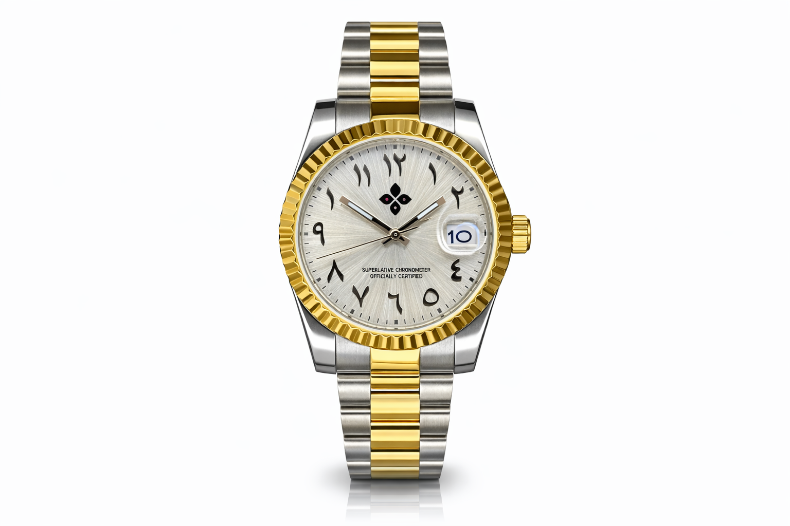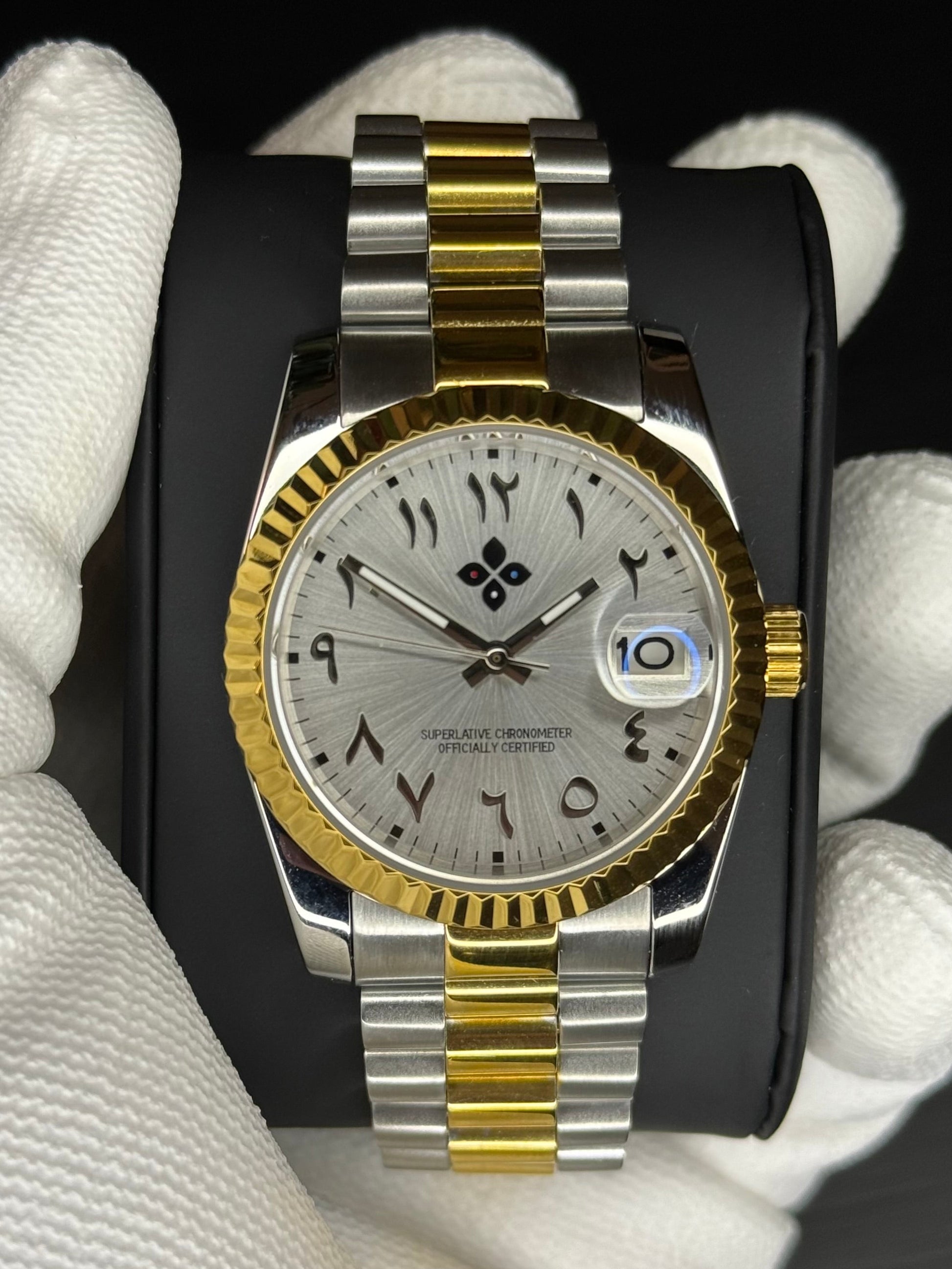 The Valora Arabic is a refined two-tone timepiece that blends polished stainless steel with warm gold accents for a timeless and elegant presence. Its silver sunburst dial, detailed with distinctive Arabic numerals, creates a unique balance between classic character and modern refinement. Powered by the reliable Seiko NH35 automatic movement and protected by scratch-resistant sapphire crystal, this watch offers proven accuracy, durability, and everyday reliability. Finished with a fluted bezel and a comfortable Jubilee-style bracelet, the Valora Arabic is available in 36 mm and 40 mm, making it a versatile statement for both daily wear and special occasions.